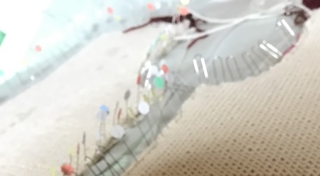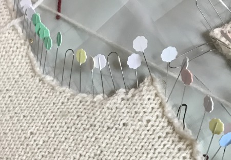 前後見頃分だと、ピンが不足してしまい、編み物用まち針も使用してなるべく細かくピン打ちをしています。