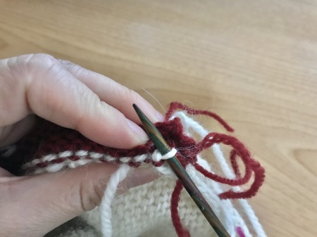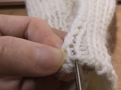 拾う目がわかれば、最初の綴じ合わせる目がずれないように気を付けて一目ずつ拾って進めていきました。