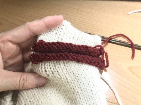 一目ゴム編み部分を抜けると、本体編み部分へ移行しています。