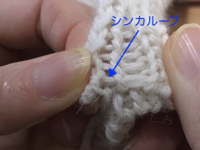 編み目がしっかりと見えるように広げ、拾う目(シンカーループ)を確認しています。