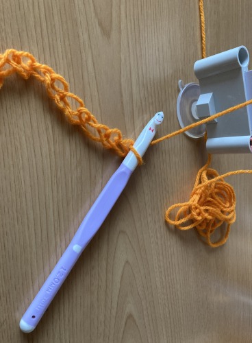 初めての編み物だったので、まだ握り方が難しく、最初はなんとなく編む感触を感じて頂きたく